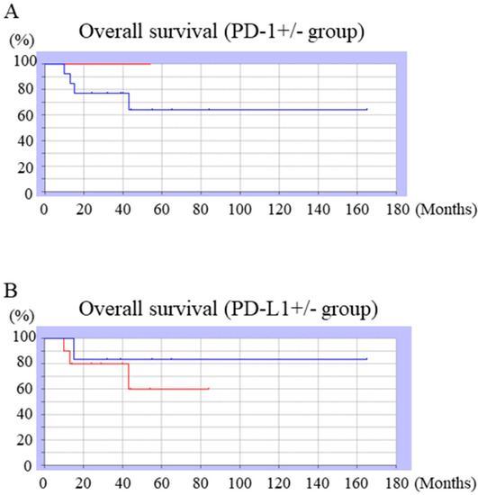 (A) The 3-year survival rate for PD-1-positive (blue line) and -negative cases (red line). The 3-year survival rate for PD-1 positive cases was 100% and that for negative cases was 64.1%, and the difference was not significant (p = 0.38); (B) The 3-year survival rate for PD-L1-positive (red line) and -negative cases (blue line).