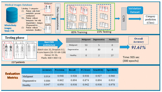 In this research study, an approach based on CNN model, as a common method in medical image analysis, is suggested for a three-class bone metastasis classification. The three-class classification problem regards bone metastasis presence, absence and cases that are linked to degenerative changes in 778 samples of male patients suffering from prostate cancer and consists of three phases, namely: preprocessing, network design and testing/evaluation. Figure 2 demonstrates the whole process for the examined dataset of 778 patients classifying them into three categories, (i) malignant (with bone metastasis presence), (ii) healthy (no bone metastasis) and (iii) degenerative (healthy, presenting degenerative changes).