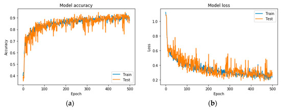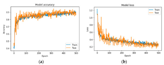 In the suggested CNN architecture, the ReLU function is used in all convolutional and fully connected (dense) layers, whereas the categorical cross-entropy function is the final activation function used in output nodes. Moreover, two performance metrics, concerning accuracy and loss, are used. As regards loss, the categorical cross-entropy function is calculated with an ADAM optimizer, which is an adaptive learning rate optimization algorithm [45]. For model training, the ImageDataGenerator class from Keras was used, offering augmentations on images like rotations, shifting, zoom, flips and more.
