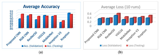 Figure 7a illustrates the classification accuracy for validation and testing for all the examined CNNs, whereas Figure 7b depicts the corresponding loss for validation and testing for all the examined CNNs.