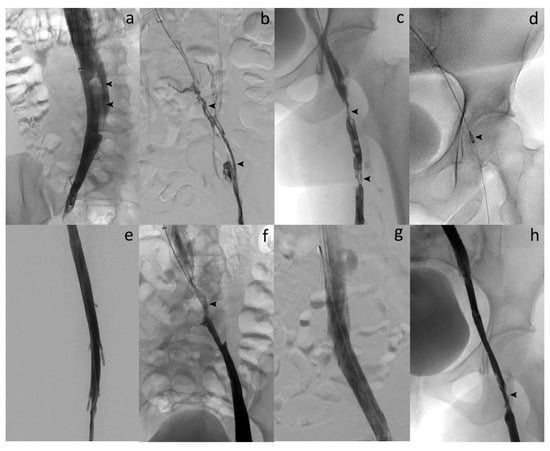 - Guillen, K.; Falvo, N.; Nakai, M.; Chevallier, O.; Aho-Glélé, S.; Galland, C.; Demaistre, E.; Pescatori, L.; Samson, M.; Audia, S.; et al. Endovascular stenting for chronic femoro-iliac venous obstructive disease: Clinical efficacy and short-term outcomes. Diagn. Interv. Imaging 2020, 101, 15–23. [Google Scholar] [CrossRef] [PubMed]