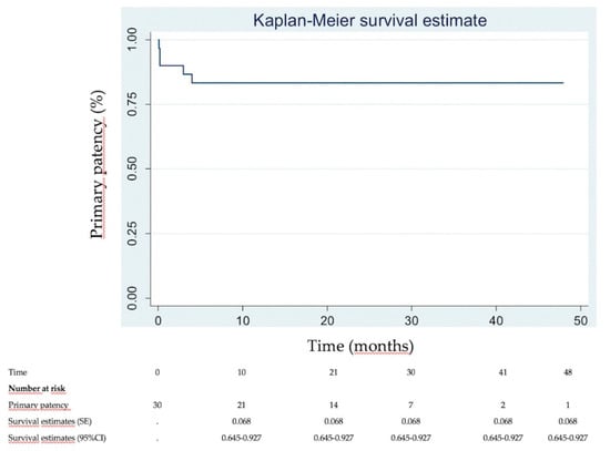 Immediate clinical success was 90% (Figure 2). None of the patients needed intensive care unit (ICU) stay. Most of patients were discharged within 2 days (83.3%). DUS revealed venous patency in 27 (90%) of the 30 patients at 1 week. Three patients had early in-stent re-thrombosis within 1 week, all successfully managed with new thrombectomy using the Aspirex®S device again. Four patients had delayed in-stent re-thrombosis. Among them, 2 already had early in-stent re-thrombosis among the 3 initial patients managed for that. Overall, the primary patency rate was then 83.3% (25/30). Among the 4 patients with delayed in-stent re-thrombosis, recanalization failed in 2 patients, and no recanalization was attempted in the other 2 patients because they were not very symptomatic. Secondary patency rate at mean follow-up of 22.3 ± 14.2 months (range, 6–48) was then 86.7% (26/30 patients). Figure 3 and Figure 4 show Kaplan–Meier curves regarding primary and secondary patency rates, respectively. At mean follow-up, PTS analysis could reveal low PTS symptoms reflected by a Villalta score between 5 and 9 in 73.3% of the patients. Moderate PTS symptoms reflected by a Villalta score between 10 and 14 was seen in 26.7%. No severe PTS (Villalta score ≥ 15) was observed. Overall, mean Villalta score in the “low Villalta score category” (n = 22) was 6.8. Mean Villalta score in the “moderate Villalta score category” (n = 8) was 11.7. No Villalta score ≥ 15 was noted. One patient died during follow-up from cancer. The outcomes are shown in Table 3.