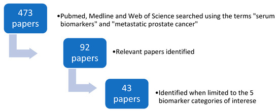 Pubmed, Medline and Web of Science were searched using the search terms “serum biomarkers” and “metastatic prostate cancer”. The search period was from April 2010 to April 2020. Four hundred and seventy papers were identified when filtered using the terms “humans” and “English” language. Ninety-two relevant papers were identified from this list. Forty-three papers were then identified when limited to the five biomarker categories of interest (Figure 1).