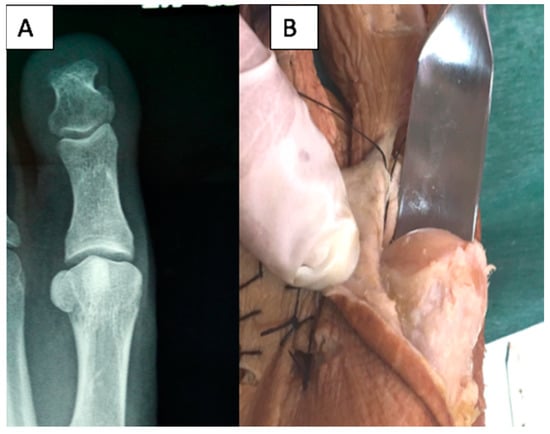 Views of a first metatarsal head showing distortion to appear crest shaped in a radiographic image performed to 30° (A) and after dissection revealing a round shape (B).