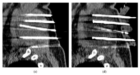 A 66-year-old male patient with extra-abdominal desmoid (EAD) tumor of the neck/cervical spine treated with percutaneous cryoablation (CA) (patient no. 4). (a,b) Sagittal gadolinium-enhanced fat-suppressed T1-weighted MR images prior to and 6 months after CA treatment, respectively. The desmoid tumor (DT) is well-delineated and homogeneously enhanced before CA. Six months after treatment, the DT has shrunk, and no residual tumor enhancement is seen; (c,d) Sagittal-reformatted CT images show several cryoprobes (19 in total) placed within the DT with the ice-ball (hypodense region) formation visible at the end of the second freezing cycle.