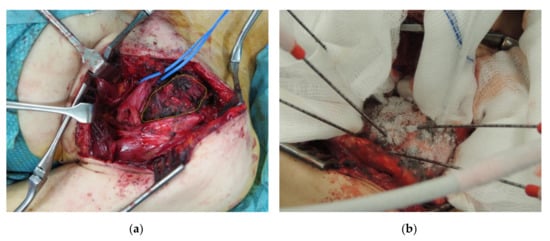 A 38-year-old female patient with EAD tumor of the left upper trunk/thoracic spine treated with open surgery CA (patient no. 7). (a) Intraoperative view of the DT (yellow outlines) with surgical exposition of the left brachial plexus (blue strings); (b) Positioning of six cryoprobes under US guidance with ice-ball formation and extension on the tumor surface.