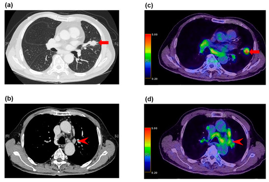 False positive FDG-PET/CT findings in enlarged lymph nodes in a 78-year-old man with squamous cell carcinoma. (a) The CT image shows a left upper lobe tumor (arrow), (b) and enlarged station 5 lymph nodes (arrowhead). (c) The FDG-PET/CT image shows FDG accumulation with a maximum SUV of 6.9 (arrow) in the squamous cell carcinoma in the left upper lobe, (d) and FDG accumulation with a maximum SUV of 3.9 in the enlarged station 5 lymph nodes (arrowhead). These lymph nodes demonstrated granulomatous inflammation at histopathologic examination of the specimen from surgical biopsy.