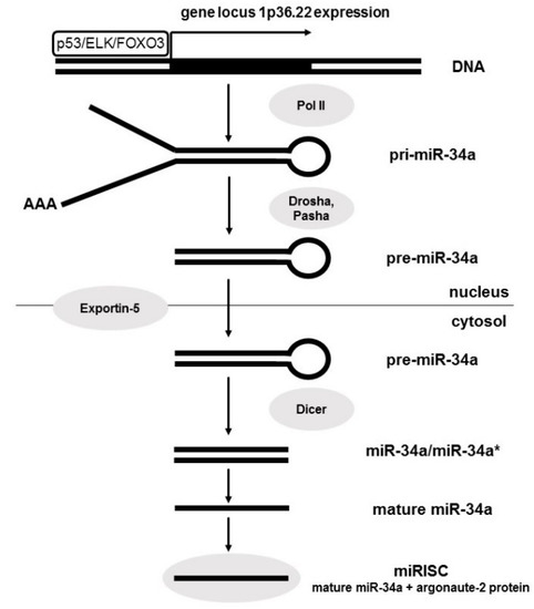 The miR-34a gene locus is at chromosome 1p36.22. This gene does not encode any other non-coding RNAs or proteins. MiR-34b and miR-34c have a common gene on the chromosome 11q23.1 and are produced by a common primary transcript. The expression of miR-34a is ubiquitous while miR-34b and miR-34c are predominantly produced in the lung [9,10]. The biogenesis of miRNA begins in the nucleus and matures in the cytoplasm. The generation of mature miR-34a is similar to the other miRNAs multistage process, which include the following steps (Figure 1). First, the miR-34a encoding gene is transcribed by RNA-polymerase II to produce the primary transcript (pri-miR-34a) in the nucleus. The crucial transcription factors inducing the expression of this gene are p53, ELK, and FOXO3. The next step is the first cleavage of pri-miR-34a by the RNAse III enzyme Drosha (which is also stimulated by p53) and, subsequently, Pasha into a special stem-loop-structure called a precursor molecule miR-34a (pre-miR-34a). This molecule is transported to the cytoplasm by Exportin 5. The last step is second cleavage by RNase III enzyme Dicer to create a short RNA duplex consisting of the mature miRNA and its anti-sense strand (miRNA*). Lastly, mature miRNA-34a is deliberated and loaded together with argonaute proteins into the RNA-induced silencing complex (RISC). This complex mediates the interaction between the miRNA and the target mRNA to mediate its direct silence [10,11].