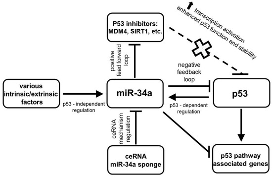 The canonical induction of miR-34a by protein p53 was documented by many researchers [12,13,14,15,16,17]. The tumor suppressor protein p53 functions as a transcription factor that regulates the expression of several miRNAs including miR-34 and family. MiR-34 gene promoters contain p53 binding sites. Notably, miR-34a is the important component of the p53 complex regulatory network [12,13,14,15]. MiR-34a is implicated in the control of many cancer-related processes and it has been validated as the important mediator of the tumor suppressive function of p53 after DNA damage by suppressing its target mRNAs, such as Bcl-2, SNAIL, etc. [16]. While p53 induces the transcription of miR-34a, this one can regulate the expression and activity of the p53 protein in a positive and negative manner. This positive feedback loop between p53 and miR-34a is mediated by post-transcriptional suppression of proteins MDM4 (and its human homolog HDM4) and/or SIRT1 expression to enhance p53 transcriptional activity and stability. Both these proteins under physiological conditions inhibit the transcriptional activity of TP53 and they are targets of miR-34a. On the contrary, the negative effect of miR-34a on gene TP53 and some of p53 pathway-associated genes may consist in direct targeting their mRNAs [17,18,19]. Navarro and Lieberman documented the enhanced p53 transcription activity in cultured cells due to miR-34a overexpression and explained a complex functional relationship between miR-34a and p53. In comparison with miR-34a, there is only a weak effect of miR-34b/c overexpression on p53 function [19].