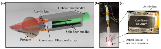 Design of the transrectal ultrasound and photoacoustic (TRUSPA) imaging device. (a) Schematic of distal end of the TRUSPA device showing the key components. An optical fiber bundle split into twenty fibers (ten each side) is closely integrated with a commercial curvilinear TRUS probe. Acrylic lenses attached to each side of the probe bend light into the US plane. (b) A photograph of the integrated device with optical illumination at 690 nm showing the optical focus at ~12 mm achieved using the acrylic lenses. (c) A zoomed view of the distal end of the device with curvilinear US array and the two acrylic lenses attached on both sides for the refraction of light.