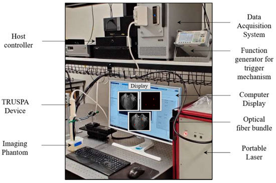 Description of the TRUSPA imaging system. The TRUSPA system consists of following key components. A portable laser: the output of this tunable laser (Phocus Mobile, Opotek Inc., Carlsbad, CA, USA) is coupled to the input end of the optical fiber bundle. Data acquisition system (DAQ): A Vantage 256 (Verasonics, Inc., Kirkland, WA, USA) system is employed for carrying RF signals to and from the TRUSPA device, enabling the real-time acquisition and beamforming of B-mode ultrasound (US) and photoacoustic (PA) images. Function generator: synchronizes the laser with the DAQ system, enabling registration of B-mode US with PA images. Imaging phantom: a tissue-mimicking phantom designed to study the deep-tissue imaging capabilities of the TRUSPA device. Computer display: displays B-mode US (grayscale), PA (red color scale), and coregistered US + PA (overlaid red PA on gray US).