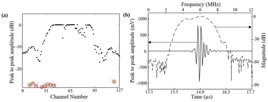 Several characterizations were performed to evaluate the performance and sensitivity of the curvilinear ultrasound array. Characterization of the pulse-echo response was achieved by placing a metal slab target in front of the array, perpendicular to the center element at approximately 11 mm distance. The peak-to-peak amplitudes (in dB) of the signals received by each of the 128 elements are plotted in Figure 3a. The nine red-circled measurements in the plot correspond to the possible dead elements in the array. To estimate the frequency and bandwidth of the array, the Fourier-transform of the pulse-echo waveform for the center element (channel #64) was calculated. Figure 3b shows the frequency band shape and the pulse-echo waveform for the center element of the array. The array exhibited a center frequency of 6 MHz and a 6-dB fractional bandwidth of 55%.