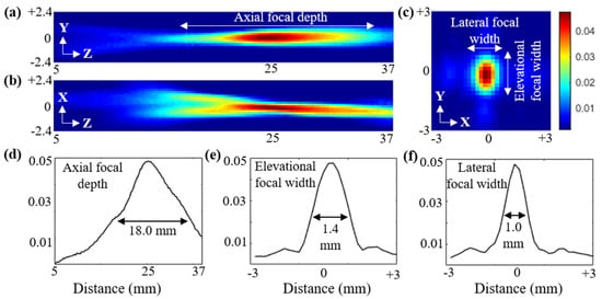 After characterizing the sensitivity of individual elements in the curvilinear transducer array, characterization of the ultrasound field of the complete array was performed using a calibrated hydrophone (Onda HNP-0400, Onda Corporation, Sunnyvale, CA, USA). The US field plots in all three planes crossing the on-axis focal spot (at ~25 mm distance perpendicular to the center element) were acquired. Figure 4a–c show the output US beam profile of the TRUSPA device, recorded by hydrophone along the elevational (Y–Z), axial (X–Z), and the lateral (X–Y) planes, respectively. The device was placed in a water tank, and the hydrophone was mechanically scanned using an XYZ scanner. The excitation with 1.6 V AC supply yielded ~0.5 MPa output peak-to-peak pressure at the focus (z = 25 mm). The X–Y plane was measured at a distance of 25 mm from the probe. To calculate the focal depth of the TRUSPA device, the beam profile along the axial direction in the Y–Z field was plotted (Figure 4d). The calculated axial focal depth at 50% drop is 18.0 mm. Further, the beam profiles along the elevational and lateral directions in the X–Y field were plotted to measure the focal width in the lateral plane around the focal region. The calculated values of elevational focal width (Figure 4e) and lateral focal width (Figure 4f) at 50% drop are 1.4 mm and 1.0 mm, respectively.