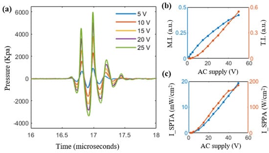 (a) Output pressure of the TRUSPA device recorded by hydrophone as a function of varying supply AC voltages in the range of 5 V to 25 V with 5 V intervals. (b) Plot of mechanical index (MI) and thermal index (TI) after 0.3 dB.cm−1.MHz−1 de-ration with respect to the supplied AC voltage. (c) Plot of spatial-peak temporal average (ISPTA) and spatial-peak pulse average (ISPPA) values after 0.3 dB.cm−1.MHz−1 de-ration with respect to the supplied AC voltage.