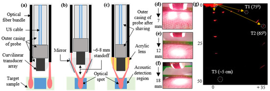 To compare the photoacoustic FOV of the novel TRUSPA device with previously reported devices, a 0.3 mm pencil lead target was placed orthogonal to the imaging plane at various positions in an optical scattering medium (20 cm−1 reduced scattering coefficient). As can be seen in Figure 6g, the target T1 (~75 degrees off from the center of the transducer) suggests an FOV of ~150 degrees at a depth of ~7 mm. At ~15 mm depth, the target T2 suggests an FOV of ~130 degrees. This matches the US FOV (~135 degrees) reported in the datasheet of the C8-4v probe, as well as the PA FOVs reported for the designs in Figure 6a (~160 degrees [23]) and Figure 6b (~145 degrees [24]). The target (T3) in Figure 6g also demonstrates the capability of the TRUSPA device to image PA targets up to 5 cm deep in a highly scattering medium.