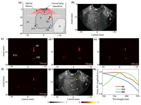 Next, the results of using the TRUSPA device to image the prostate phantom described above are presented. Figure 8b shows a typical B-mode US frame displaying the anatomical information of the fabricated prostate tissue phantom with the prostate (P), bladder (B), soft-tissue (ST), and rectum (R) regions labelled. Figure 8c–f show the B-mode PA images acquired at 700 nm, 750 nm, 800 nm, and 850 nm optical excitation wavelength, respectively. Thanks to the high optical absorption of the three molecular targets embedded in the prostate region, the PA images are able to display all three molecules with varying PA intensities depending on their optical absorption spectra. Figure 8g shows a coregistered B-mode US + PA image at 850 nm with the US image in grayscale and the PA image overlaid in hot scale. The mean PA intensities for the three target regions as a function of excitation wavelength are plotted in Figure 8h. The obtained plots for the Hb, ICG, and MB targets closely match with their respective standard spectral plots [35]. For example, the peak response of ICG at around 780 nm and the standard decay of the MB response with increasing wavelength can be observed in Figure 8h. These results demonstrate the feasibility of the TRUSPA device for structural and functional imaging of deeper tissue regions.