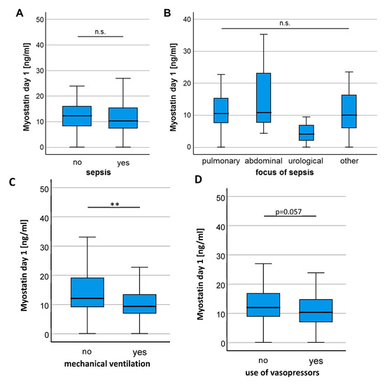 However, the relevance of Myostatin in daily treatment of ICU patients with regard to existing and well-established scoring systems is debatable. Cachexia is a complex multifactorial syndrome associated with underlying illness and characterized by loss of skeletal muscle and fat mass. In contrast to malnutrition, cachexia cannot be reversed simply by increasing nutritional intake [10] and has been associated with an unfavorable outcome in manifold diseases [11,12,13]. Of note, up to 80% of critically ill patients treated on a medical ICU display clinical sign of cachexia underscoring the outstanding importance of this disease in the management of ICU patients [14,15]. Considering that Myostatin was shown to play a pivotal role in muscle wasting in other diseases and the fact that cachexia is a negative prognostic factor in critical illness we hypothesized that Myostatin might play a relevant role in the course of critically ill patients with and without sepsis. Therefore, we aimed at investigating Myostatin serum levels in a cohort of critically ill patients on a medical ICU at University Hospital RWTH Aachen to answer the following questions: How is Myostatin regulated in ICU patients compared to healthy controls (primary objective)? Is there an association between Myostatin levels and the severity of organ dysfunction or the presence of sepsis (secondary objective)? Might Myostatin function as a short- or long-term prognostic biomarker in ICU patients (tertiary objective)?