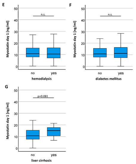 In a next step, we analyzed if individual disease characteristics of ICU patients influence circulating Myostatin levels. There was no significant difference of Myostatin serum levels between patients who did or did not fulfill the criteria for sepsis (Figure 2A) and patients with different sources of sepsis had comparable Myostatin values (Figure 2B). Interestingly, we observed significantly lower Myostatin levels in patients who required mechanical ventilation (Figure 2C) and a trend towards lower Myostatin levels in patients who depended on intravenous vasopressors at ICU admission (p = 0.057, Figure 2D), arguing that a more severe disease stage might be associated with lower Myostatin serum levels. In contrast, Myostatin serum levels were comparable between patients on regular hemodialysis (Figure 2E) and patients with or without diabetes mellitus (Figure 2F), while patients with liver cirrhosis showed a trend towards higher Myostatin levels compared to non-cirrhotic patients (p = 0.081, Figure 2G).