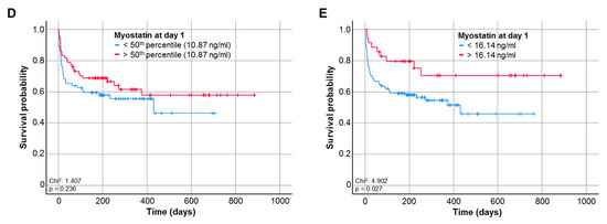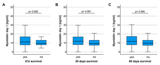 Interestingly, we observed a trend towards a normalization of Myostatin concentrations between admission and day 7 of ICU treatment, which is in line to recently published results [18]. Notably neither Myostatin levels at day 7 of ICU treatment nor the difference between admission and day 7 were predictive for the patients’ outcome, which might be explained by the very small sample size at day 7. Regarding overall survival, low Myostatin levels at admission to the ICU were indicative for an unfavorable clinical outcome. At the respective optimal cut-off value that was established using a recently described biometric software [17], low Myostatin levels (<16.14 ng/mL) turned out as powerful predictor of OS. Strikingly, our data are in line to previous results from patients with cancers, where low Myostatin levels were associated with an increased long-term mortality [27,28]. These data indicate that there might be a prognostic advantage of increased Myostatin quantities. However, a potential benefit of higher Myostatin concentrations requires further investigation since previous studies describe contradictory results, especially regarding the treatment of sarcopenia: For example, the antagonism of Myostatin enhanced muscle regeneration during sarcopenia and reduced muscular dystrophy in mice [29,30]. Based on these results, clinical trials had been started to evaluate a benefit of interventions with myostatin inhibitors [31,32]. The human monoclonal antibody bimagrumab binds to Activin receptor type 2, thereby inhibiting the interaction of the ligands Myostatin with Activin resulting in skeletal muscle hypertrophy [32,33]. Future studies should therefore address both the advantageous effects on muscle growth as well as potential side effects with relevance for long-term survival in critically and chronically ill patients.