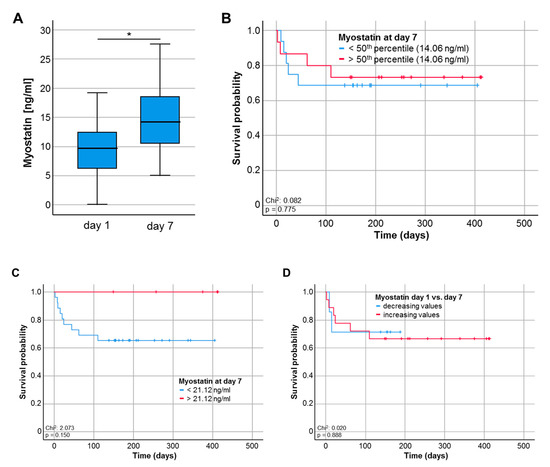 Myostatin serum levels during the course of critical illness. (A) Myostatin serum levels are significantly higher at day 7 following ICU admission compared to the respective levels at day 1, * p < 0.05. (B,C) Patients with Myostatin serum levels below the 50th percentile (14.06 ng/mL) or the ideal prognostic cut-off value (21.12 ng/ml) at day 7 following ICU admission show a trend towards an impaired OS (p = 0.150). (D) ICU patients with increasing or decreasing Myostatin levels between day 1 and 7 have a comparable OS (Figure 4D).