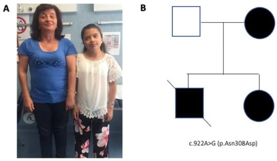 The patient was born to non-consanguineous parents at 33 weeks after an non pathologic gestation. No abnormality was noted at birth; however, since the first month of life she showed slight development delay, reduced growth and dysmorphic facial features. Due to a holosystolic heart murmur detected in the second week of life, an echocardiography was performed revealing pulmonary valve stenosis. At one month, based on these clinical features, the patient was suspected to have NS and a genetic analysis performed using a dedicated gene panel (BRAF, CBL, CDC42, HRAS, KRAS, MAP2K1, MAP2K2, NF1, NRAS, PTPN11, RAF1, RIT1, RRAS, SHOC2, SOS1, SOS2 and SPRED1) revealed the pathogenic PTPN11 variant NM_002834.3 (c.922A>G, p.Asn308Asp), one of the most common mutations associated with NS [3]. Sanger sequencing detected the same variant in her mother, confirming cosegregation of the mutation with disease in this family (Figure 1A,B). In addition, a maternally transmitted missense variant in SPRED1 (c.182G>A, p.Arg61His; NM_152594.3) was identified. This missense change was classified as “likely benign”, based on the American College of Medical Genetics criteria (PM1, BS2, BP1, BP4). Family history was positive for pulmonary stenosis in one brother, who died at the age of 13 years for acute lymphoblastic leukemia. No clinical report or biologic material to be analyzed was available.