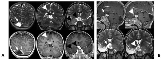 Figure 2. (A) Coronal T2w (top row) and T1w (bottom row) images show cystic lesion in the cerebellum with a peripheral enhancing nodule (arrows), a small hyperintense lesion without contrast-enhancement involving the right gyrus cinguli (arrow heads). There is also a suprasellar/chiasmatic lesion (black arrows) with avid contrast-enhancement and cystic components, consistent with optic pathway glioma and a hyperintense and non enhancing lesion involving the right mesial temporal lobe (black arrow heads); (B) sagittal GdT1w (top row) and coronal T2w (bottom row) images show optic pathway glioma before (arrows) and during treatment (arrow heads).