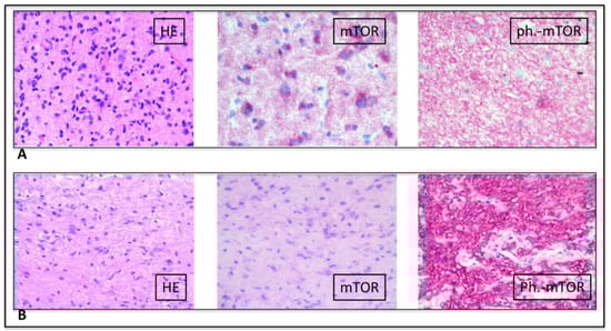 Figure 3. (A) (upper raw) (low-grade glioneural tumor): HE: Low intensity glial proliferation with intermingled few dysplastic ganglion cells. Mild nuclear atypia and low proliferation index. mTOR: mild cytoplasmic positivity of neoplastic cells. Phospho–mTOR: strong cytoplasmic positivity of neoplastic cells; (B) (lower raw) (pilocytic astrocytoma): HE: Pilocytic glial proliferation in a fibrillary background with evidence of some Rosenthal fibers. Mild nuclear atypia and low proliferation index. mTOR: mild cytoplasmic positivity of neoplastic cells. Phospho–mTOR: Strong cytoplasmic positivity of neoplastic cells.