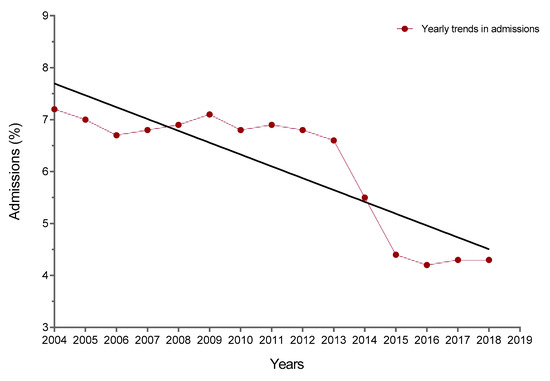 The number of hospitalizations decreased over time with a significant linear trend (Figure 2). The slope of annual change was significantly different from zero; it was −0.2278 per year (95% CI, −0.3094 to −0.1463; p < 0.0001). The admission rate was 7.2% in 2004–2005, 6.8% in 2012–2013, and 4.3% in 2018–2019 (Table 1). The median time to admission throughout the entire study period was 7.5 (6–9) days. For 2004–2005, the time to admission was 8 (6–9) days and it decreased to 6 (5–7) days in 2014–2015 and 5 (4–6) days in 2018–2019 (p < 0.0001).