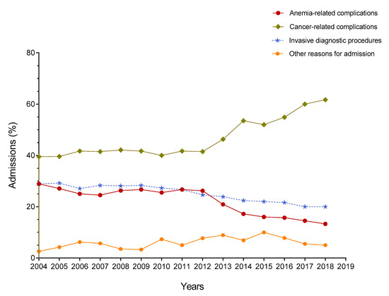 Out of 825 patients, 207 (25.1%) were hospitalized for undergoing invasive diagnostic procedures and this rate decreased significantly from 28.9% during 2004–2005 to 22% during 2015–2016 to 20% in 2018–2019 (p < 0.0001; Figure 3). In all three major admission categories (cancer-related complications, anemia-related complications, and invasive procedures), the slopes of yearly change were significantly different from zero (p < 0.0001). A further 50 (6.1%) patients were hospitalized due to other causes.