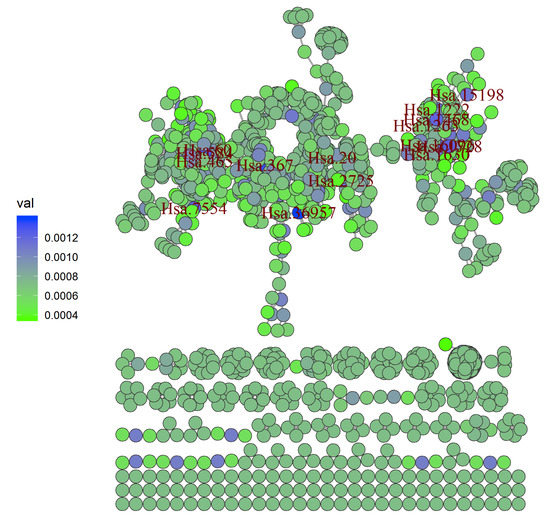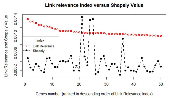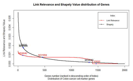 Figure 4 exhibits the distribution of the LRI of 2000 genes from highest to lowest in a rank-wise manner for each gene. We also plot the position of the three biomarkers, namely (CD44) M59040, (ALDH1A1) M31994, and (CD24) L33930, to show their relative position in this distribution. Shapely values of corresponding microarray games, arranged from highest to lowest, are also presented to compare the distribution pattern and relative position of the three biomarkers. LRI was able to correctly estimate the expected relative position of these colon cancer biomarkers. On the one hand, the Shapely value exhibited an exponential increase in the score, the LRI, which is based on the contribution of each gene in the co-expression network, exhibited a nonlinear curve in the distribution of the scores of 2000 genes.