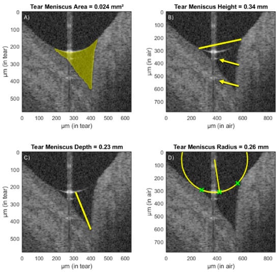 Assessment of tear meniscus area (A), tear meniscus height (B), tear meniscus depth (C) and tear meniscus radius (D) using ultrahigh-resolution optical coherence tomography. Reprinted from Stegmann et al. 2019 [36].