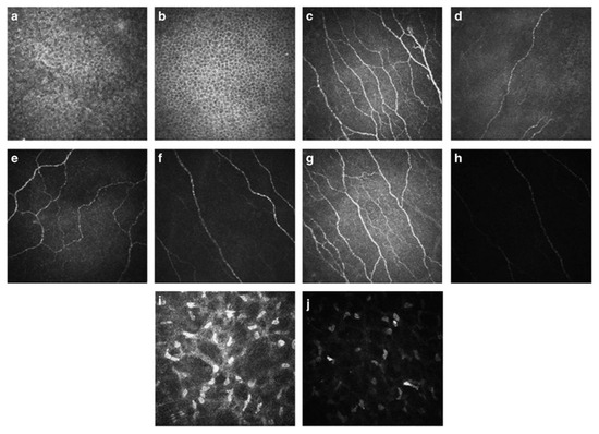 IVCM images of a patient with dry eye disease before and after six months of treatment with topical cyclosporine. Cell density of the intermediate epithelium of the cornea (a,b), number of nerve fibers of subbasal plexus in the cornea (c,d), nerve fiber tortuosity of subbasal plexus in the cornea (e,f), nerve fiber reflectivity of subbasal plexus in the cornea (g,h) and keratocyte activation in the cornea (i,j) are shown, the first picture always represents baseline and the second picture findings after six months therapy in the same patient. Reprinted from Iaccheri et al., 2017 [64].