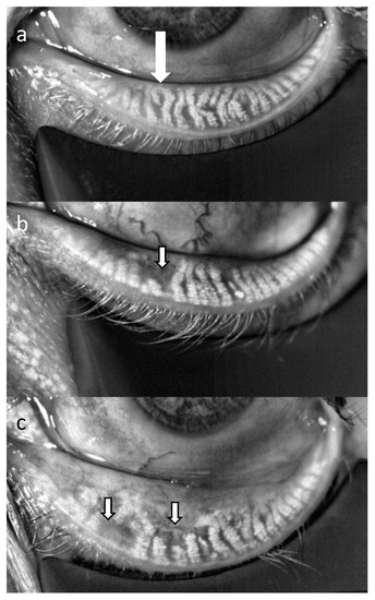 Infrared images of the Meibomian glands of the lower eyelid in a healthy subject (a), a patient with mild Meibomian gland dysfunction (MGD) (b) and a patient with moderate MGD (c). Areas of gland dropouts can be clearly seen (arrows). The images were taken with the LipiView interferometer (TearScience, Morrisville, NC, USA).