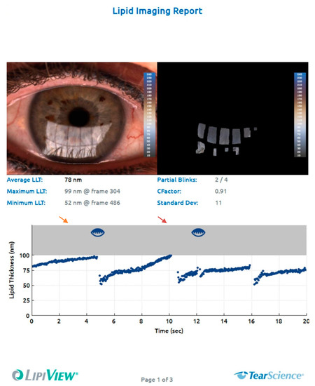 Measurement of lipid layer thickness and blink frequency with the LipiView Interferometer (TearScience, Morrisville, NC, USA). The system provides average, maximum and minimum lipid layer thickness (LLT) values in absolute nm values, measured over a period of 20 s. In addition, blink frequency is registered, including complete and partial blinks. The arrows indicate partial blinks.