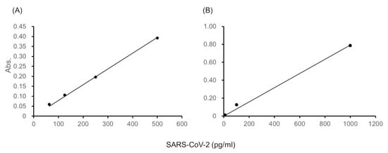The ultrasensitive ELISA produced linear calibration curves for SARS-CoV-2 spike proteins as the antigen in the range of 10–2000 pg/mL (Figure 2). For example, the linear calibration curve that was obtained from the blank-subtracted absorbance of thio-NADH at 60 min of thio-NAD cycling for SARS-CoV-2 spike proteins in the range of 63–500 pg/mL could be expressed as y = 8.0 × 10−4x, R2 = 1.00 (Figure 2A), and that for SARS-CoV-2 spike proteins in the range of 10–1000 pg/mL as y = 8.0 × 10−4x, R2 = 1.00 (Figure 2B). In this case, the LOD of SARS-CoV-2 spike proteins was 2.3 × 10−18 moles/assay for the range of 63–500 pg/mL (Figure 2A), and the LOD was 2.4 × 10−18 moles/assay for the range of 10–1000 pg/mL (Figure 2B). The LOQ of SARS-CoV-2 spike proteins was 7.5 × 10−18 moles/assay for the range of 63 - 500 pg/mL (Figure 2A), and the LOQ was 8.0 × 10−18 moles/assay for the range of 10–1000 pg/mL (Figure 2B). Thus, the ultrasensitive ELISA detected SARS-CoV-2 spike proteins at the attomole level. Because the molecular mass of the antigen was 78.3 kDa and the assay volume was 100 μL, the LOD and LOQ correspond to 1.8 and 5.9 pg/mL, respectively.