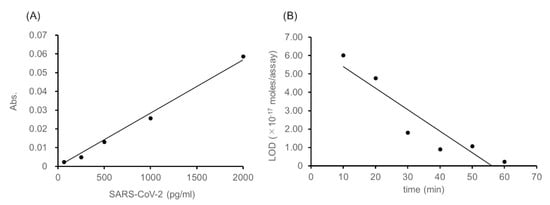 Linear calibration curve obtained from the absorbance at 10 min of thio-NAD cycling and the relation between the period of thio-NAD cycling and the LOD for SARS-CoV-2 spikes. (A) Cycling reaction time of 10 min. This linear calibration curve is expressed as y = 3.0 × 10−5x, R2 = 1.00 in the range of 63–2000 pg/mL. (B) The relation between the period of thio-NAD cycling and the LOD for SARS-CoV-2 spikes. This relation is expressed as y = −1.0 × 10−18x + 7.0 × 10−17, R2 = 0.86 in the range of 10–60 min of thio-NAD cycling.