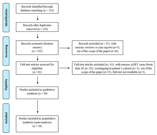 The literature search revealed 132 articles. Reviewing titles, abstracts, and full texts, we excluded 94 articles. Therefore, 38 studies were selected and included in the qualitative analysis, while 18 articles were considered for the meta-analysis (Figure 1).