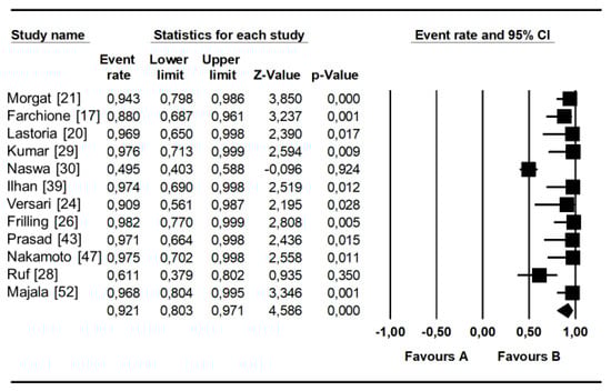 As shown in Table 3, the pooled sensitivity and specificity of SSR-PET/CT for the assessment of primary pNET were 79.6% (95%CI: 70.5–87%) and 95% (75–100%) with a heterogeneity of 59.6% and 51.5%, respectively (both ps = ns). Moreover, the pooled diagnostic odds ratio (DOR) value was 35.579 (95%CI: 4.673–270.90), with a heterogeneity of 21%. Pooled detection rates for the primary tumors were 81% (95%CI: 65–90%) and 92% (95%CI: 80–97%), respectively, at patient-based and lesion-based analysis (Figure 3 and Figure 4). A slight asymmetry in the forest plots was found for each analysis; therefore, publication bias may be present in the lesion-based and patient-based analyses (see also the corresponding Funnel Plots in Figure S1A,B).