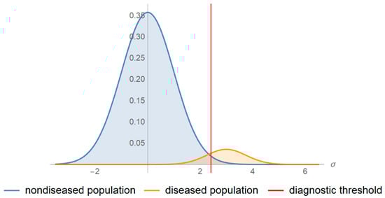 Probability density function plots. The probability density function plots of a measurand in a non-diseased and diseased population.