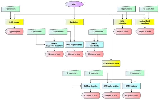 Program flowchart. The flowchart of the program with the number of input parameters and of output types for each module or submodule (DAM: diagnostic accuracy measure).