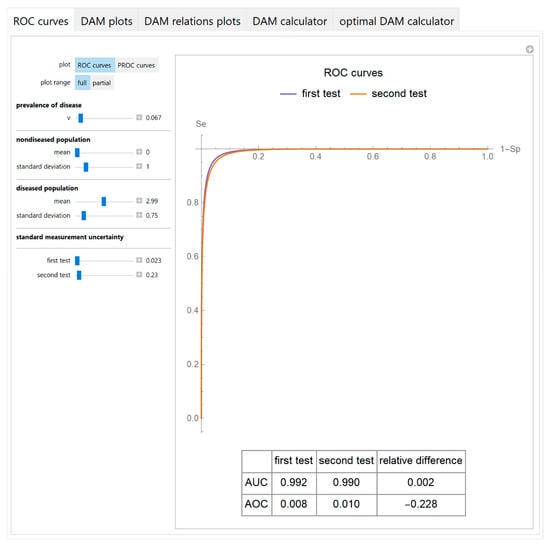 ROC curves module screenshot. ROC curves plots of two screening or diagnostic tests measuring the same measurand with different uncertainties, with the settings at the left.
