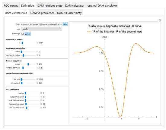 DAM plots module, DAM against threshold submodule screenshot. Ratio of the risk (R) of two screening or diagnostic tests measuring the same measurand with different uncertainties, against diagnostic threshold (d) curve plot, with the settings at the left.