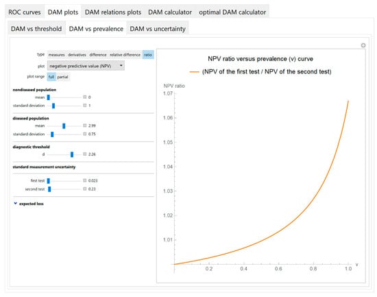 DAM plots module, DAM against prevalence submodule screenshot. Ratio of the negative predictive value (NPV) of the two screening or diagnostic tests measuring the same measurand with different uncertainties, against prevalence (v) of the disease curve plot, with the settings at the left.