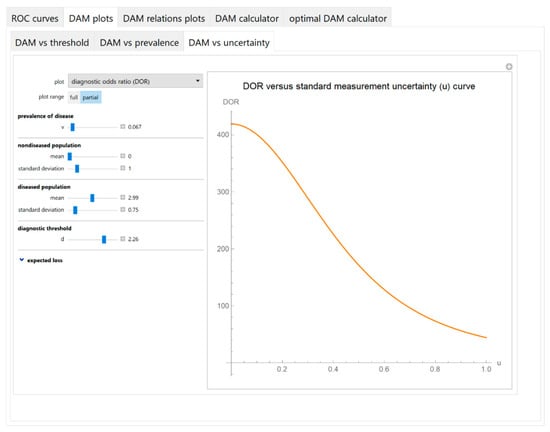 DAM plots module, DAM against uncertainty submodule screenshot. Diagnostic odds ratio (DOR) against standard measurement uncertainty (u) curve plot with the settings shown at the left.