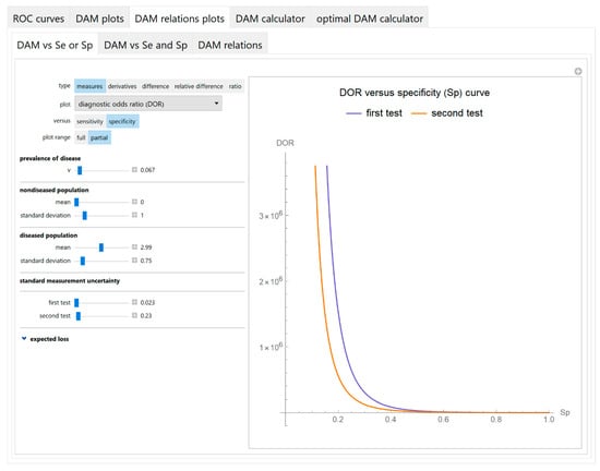 DAM relations plots module, DAM against sensitivity or specificity submodule screenshot. Diagnostic odds ratio (DOR) of two screening or diagnostic tests measuring the same measurand with different uncertainties, against specificity (Sp) curve plot, with the settings shown at the left.