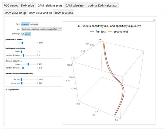 DAM relations plots module, DAM against sensitivity and specificity submodule screenshot. Likelihood ratio for a positive test result (LR +) of two screening or diagnostic tests measuring the same measurand with different uncertainties, against sensitivity (Se) and specificity (Sp) curves plot, with the settings shown at the left.