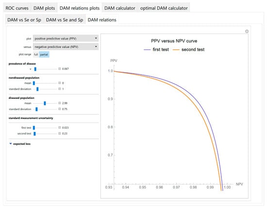 DAM relations plots module, DAM relations submodule screenshot. Positive predictive value (PPV) of two screening or diagnostic tests measuring the same measurand with different uncertainties, against negative predictive value (NPV) curves plot, with the settings at the left.