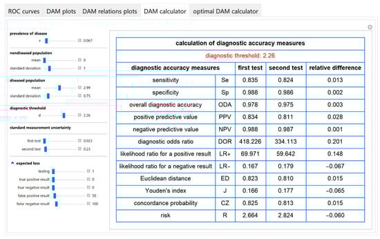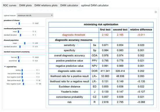 The values of the diagnostic accuracy measures or the corresponding risk of the two tests, their partial derivatives with respect to standard measurement uncertainty, their difference, relative difference and ratio are plotted against the diagnostic threshold of each test (Figure 4).