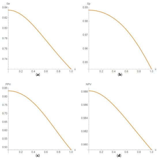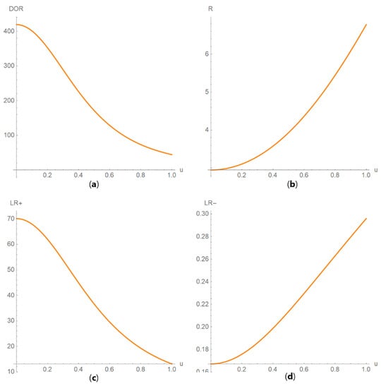Following Table 3 and Equations (4)–(7), the diagnostic accuracy measures of a test are defined as functions of either its diagnostic threshold, sensitivity, or specificity. Consequently, the derived parametric equations defining each measure can be used to explore the relations between any two measures.