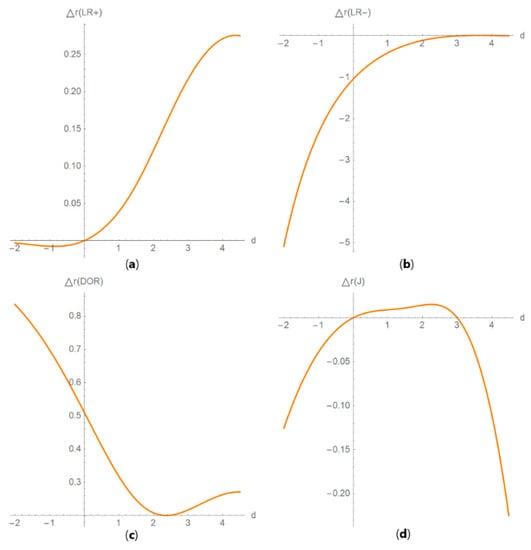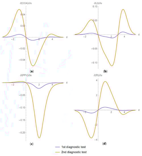 The values of the diagnostic accuracy measures or the corresponding risk of the two tests or their partial derivatives, with respect to standard measurement uncertainty, are plotted against the sensitivity and the specificity of each test in three-dimensional line plots (Figure 8).